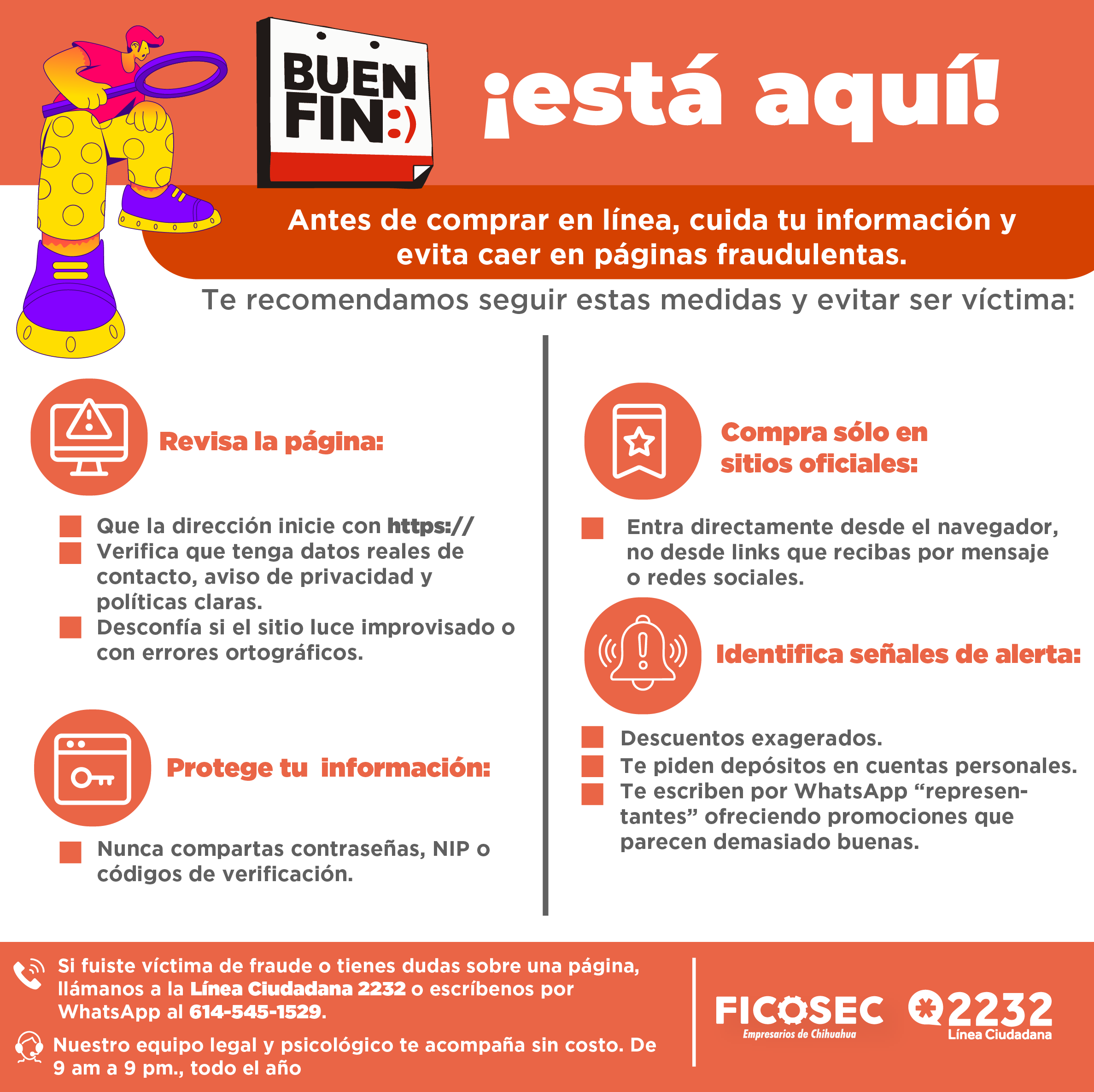 Con motivo del Buen Fin este 2025, la Línea Ciudadana de FICOSEC pone a su disposición las marcaciones *2232 y el whatsapp 614 545 15 29 para que la comunidad llame sin costo y reciba asesoría jurídica y psicológica gratuita, en caso de necesitar apoyo ante cualquier intento de fraude, extorsión u otro tipo de delito derivado de esta temporada de alta demanda comercial.