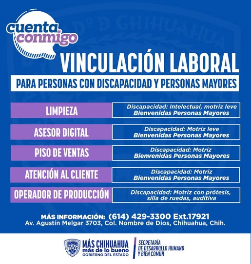 Con el objetivo de fomentar la inclusión en el ámbito laboral, la Secretaría de Desarrollo Humano y Bien Común (SDHyBC) dio a conocer nuevas vacantes dirigidas a personas con alguna discapacidad y adultos mayores, como parte de las acciones impulsadas por la gobernadora Maru Campos.